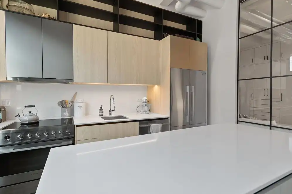 Spanning 750 sq ft, this south-facing residence features dramatic 14–20 ft ceilings that create an open, light-filled atmosphere rarely found in city living. The thoughtfully designed open-concept layout seamlessly connects the kitchen and living area, making it ideal for both everyday comfort and entertaining.