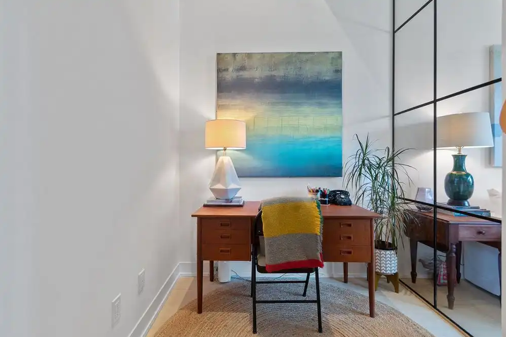 Premium finishes throughout include hardwood flooring, stone countertops, air conditioning, and in-suite laundry. A dedicated office den provides a quiet and functional workspace, perfectly suited for remote professionals or creatives seeking inspiration at home.